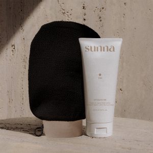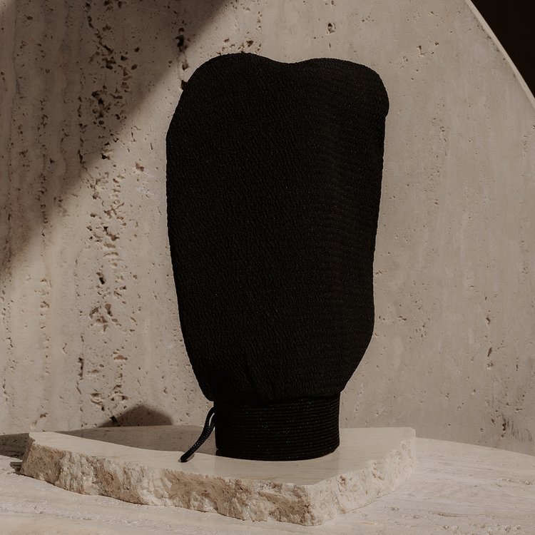 During the end of your shower, lightly wet your mitt and turn off the shower while you buff away dead skin cells in preparation for your sunless tan. Adjust the pressure based on your comfort level and use a circular motion. For better results, bathe for 5 minutes before.